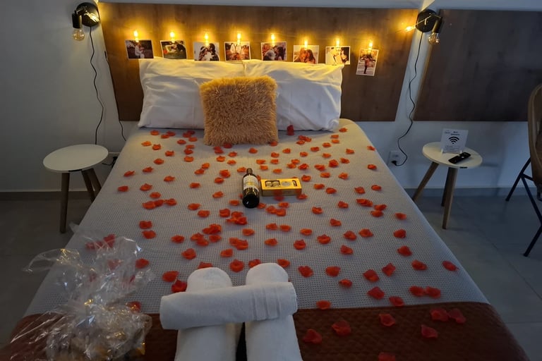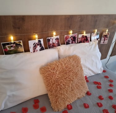 Oferecemos por um custo adicional a opção de decoração romântica. A decoração possui pétalas de rosas artificiais, varal de fotos iluminado, bombom de coco Rafaello ou bombom Ferrero Rocher acompanhado de vinho Chileno. O hóspede encaminha com pelo menos 5 dias de antecedência 8 fotos que serão impressas e colocadas no dia no varal de fotos. video_Kit_Romantico